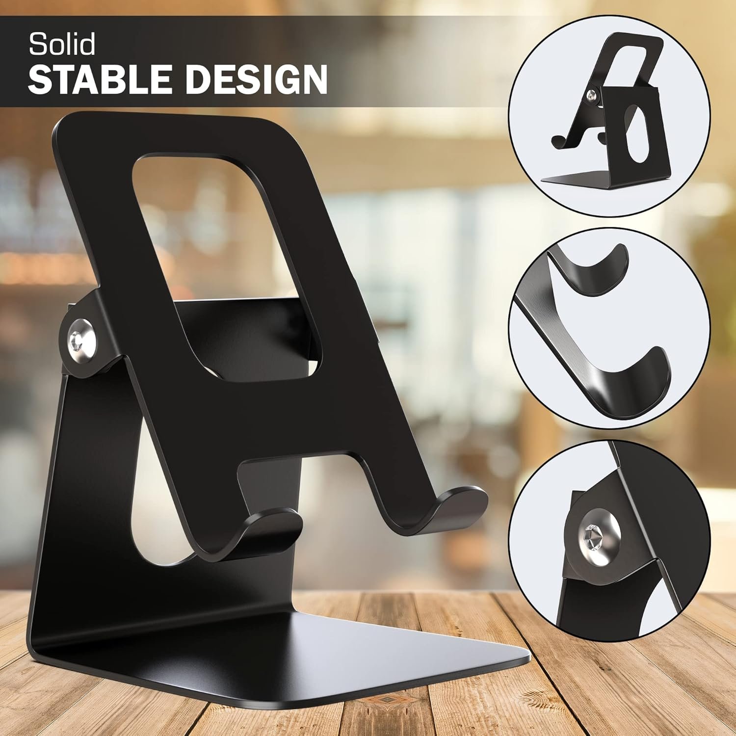 - Our phone holder for tables is made of lightweight metal, which ensures stability and longevity while keeping your gadget safe at all times. With our multipurpose phone stand, you can easily change the height and angle of your device to lessen eye and neck strain.