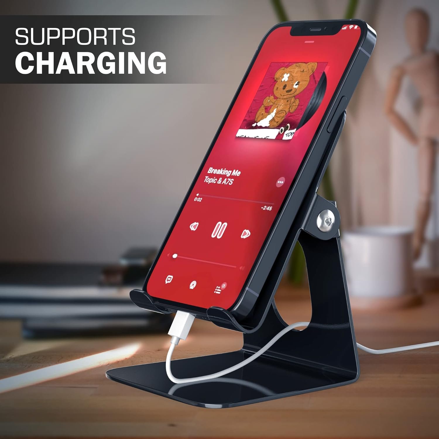 - This phone stand’s sleek and contemporary design adds flair to your workstation and blends in seamlessly with any decor. It is made especially for iPhone users and is incredibly portable. Its folding shape makes it perfect for usage at home or in the office.